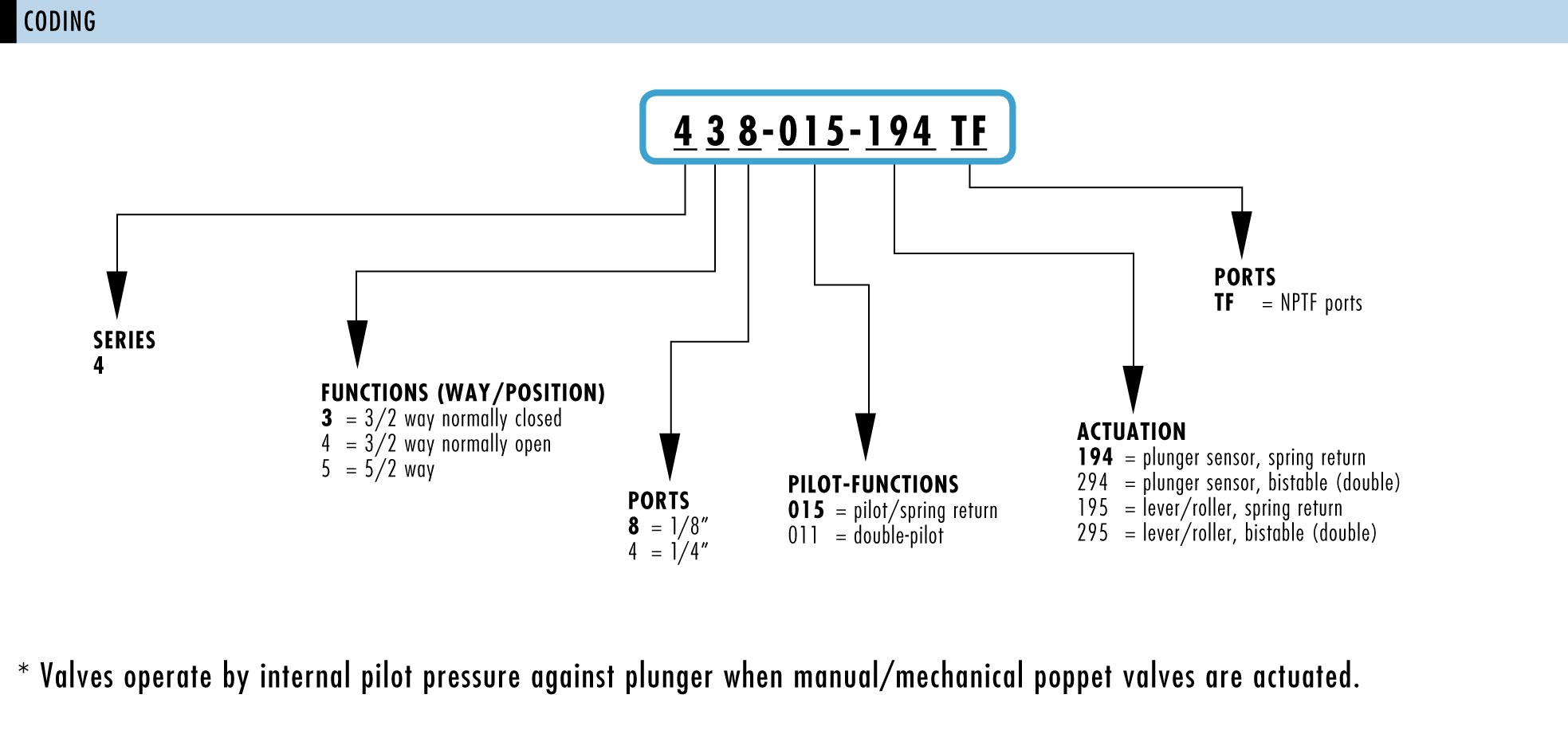 * Valves operate by internal pilot pressure against plunger when manual/mechanical poppet valves are actuated.