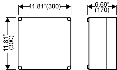 Mi 0200, Housing/Lid: Polycarbonate (Opaque), Type NEMA 4x, (IP65) Useable Space: (W) 10.83"(275) x (H) 10.83"(275) x (D) 5.75" (146) mm, Transparent Lid