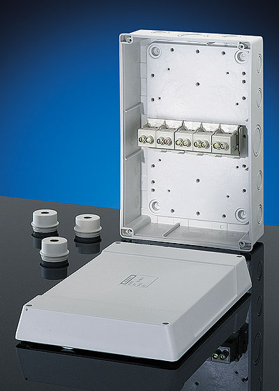 K 9502, Liquid Tight Polystrene Enclosure (Indoor Installation), from 8 - 2 AWG 3 phase, 5-pole, with Terminal Block Dimensions: (W) 12.20"(310) x (H) 8.27"(210) x (D) 4.57"(116)