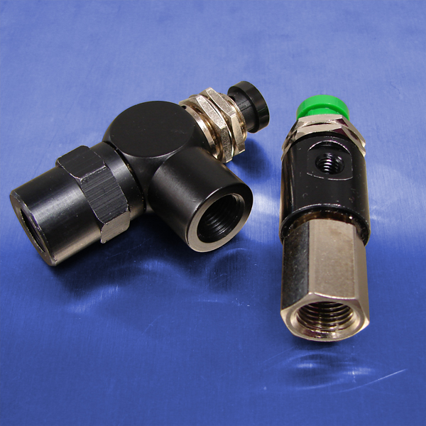 Our “11” Series valves, part numbers starting with A11, feature a swivel output port. Push-in connections are also available to speed tubing installation.